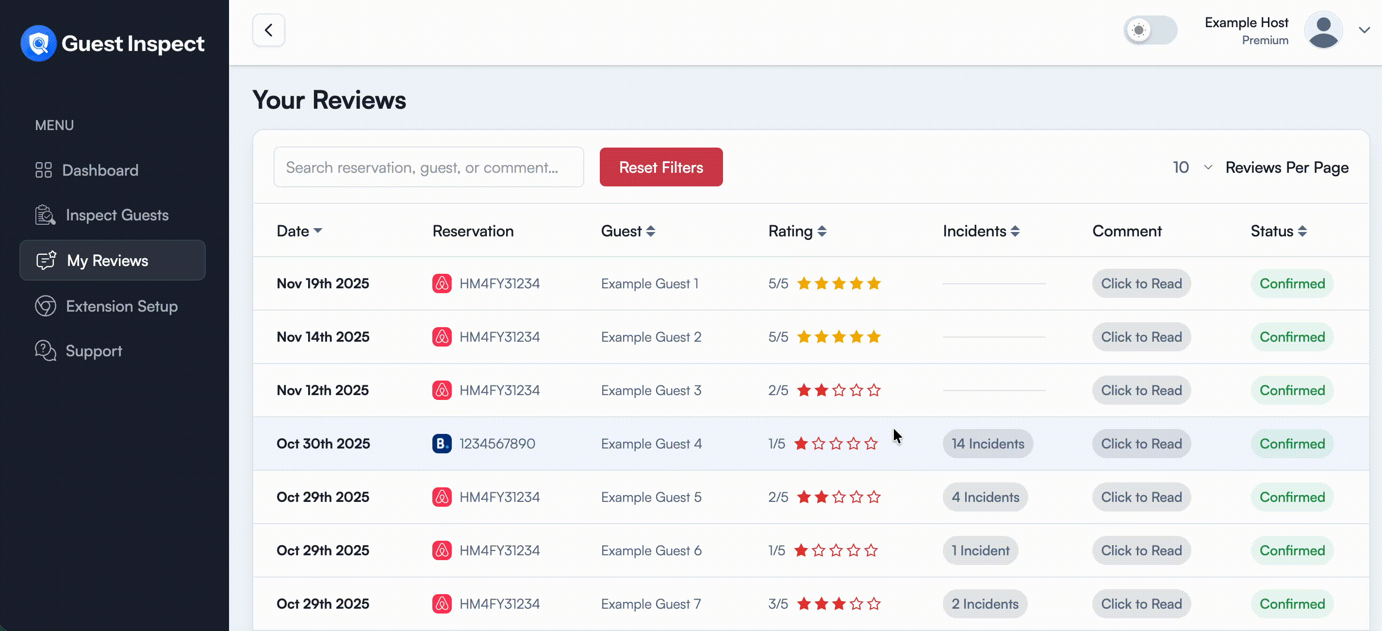 You can then search for a specific review via reservation code, guest name, or even review comment. Additional sorting is also available for certain columns and you can reset the table view at anytime by clicking the Reset Filters button