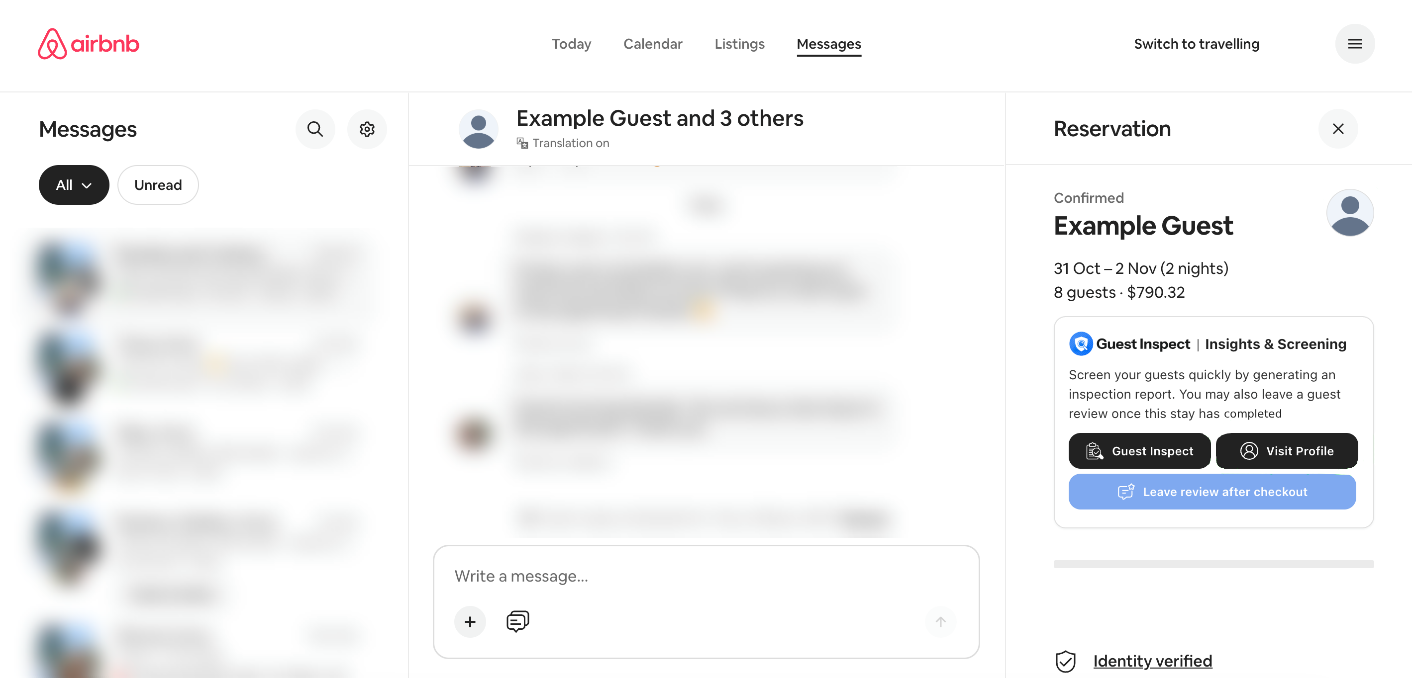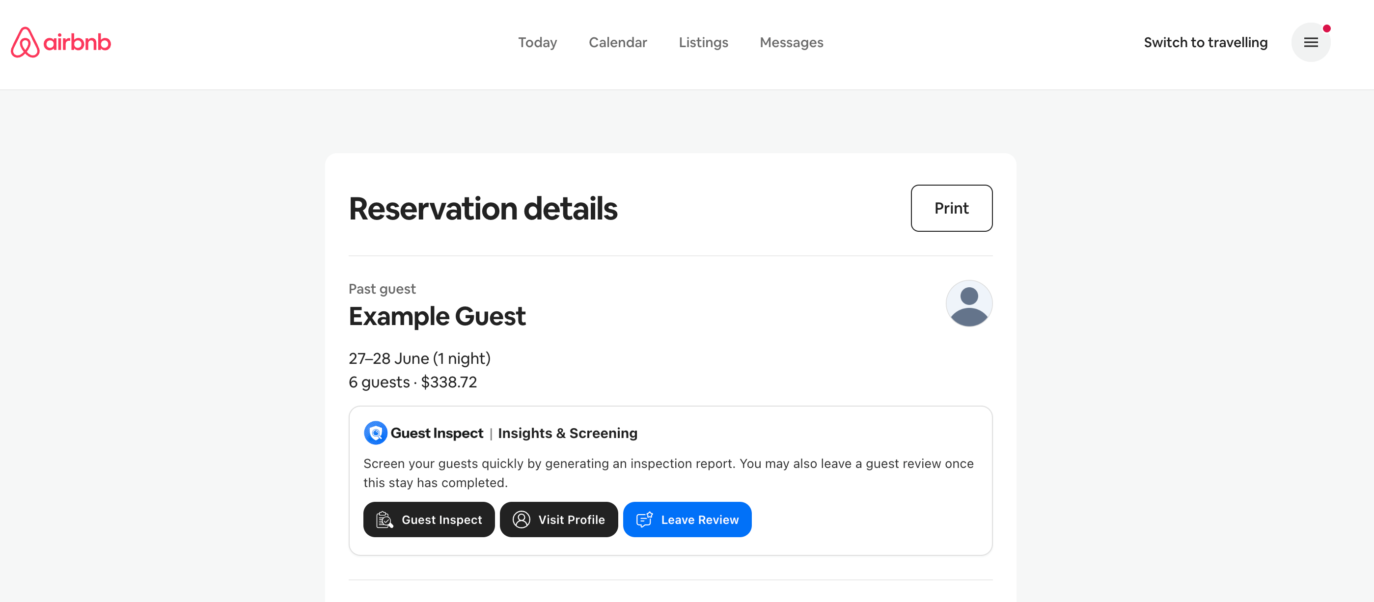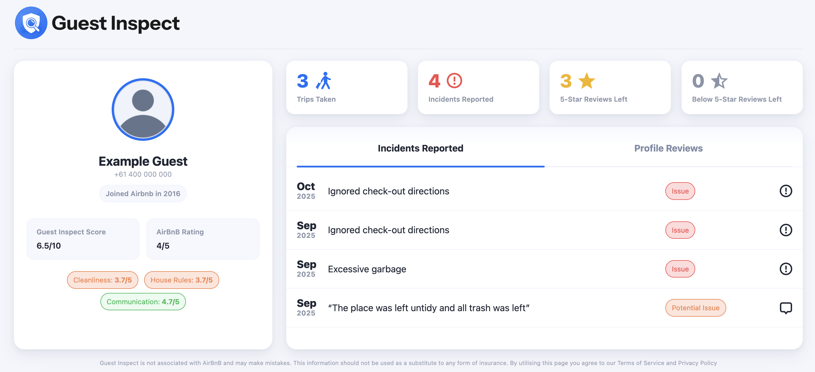 The guest information on the left is fairly self-explanatory, but it also contains their Guest Inspect Score and Platform Rating. The Guest Inspect Score is an AI generated rating we base on several factors such as platform & guest inspect reviews, incidents, number of trips and more. The platform rating is the score that AirBnB or Booking.com assigns a guest. It’s important to note that both of these scores aren’t always available, especially for new guests.Right Side: Guest History