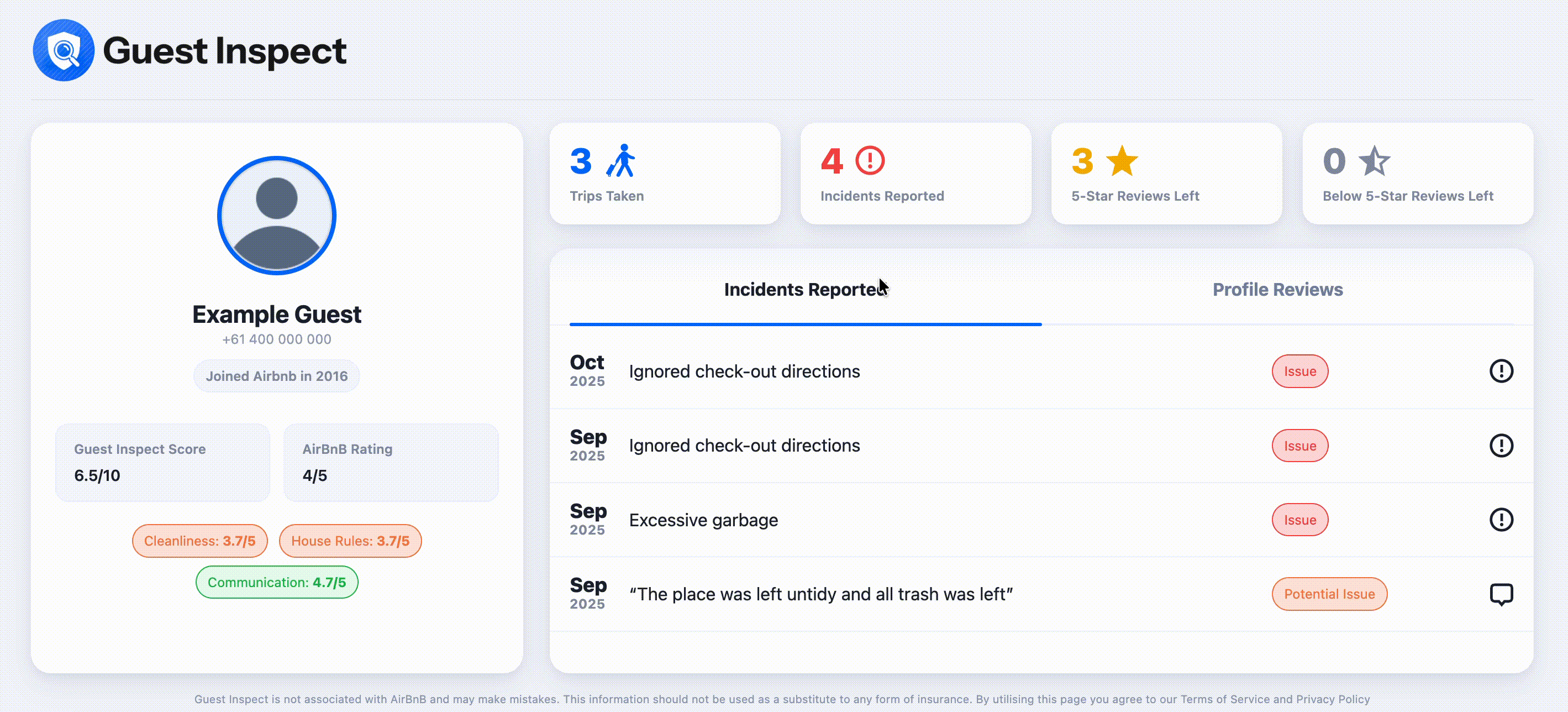 The guest’s profile history on the right will surface any incidents and potential incidents they may have caused across several rental platforms, as well as some platform-specific stats. You can also switch the table view by clicking Profile Reviews and it’ll then display any reviews prior hosts have left, as well as the guest’s reciprocal review if they left one. You may read the detailed review comments by clicking on any row in the table.