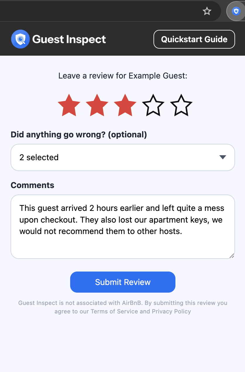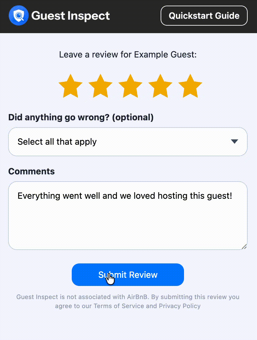 Ensure your review comments DO NOT include any personal information about the guest such as, but not limited to, phone numbers, email addresses and property address. Reviews in violation of this will be removed.