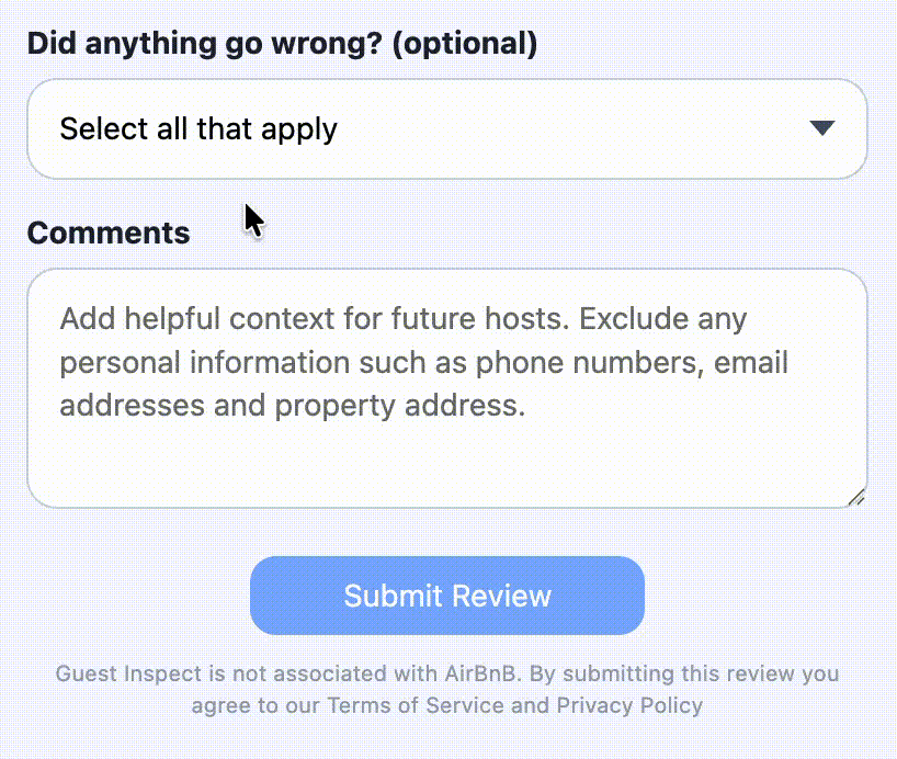This part of the review is optional and should only be used if your guest caused any incidents during their stay. Click the dropdown and select as many incidents that are applicable. If you cannot find a preset incident that applies, click the something else option then briefly fill in what happened.