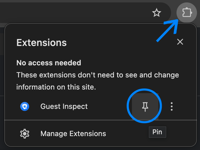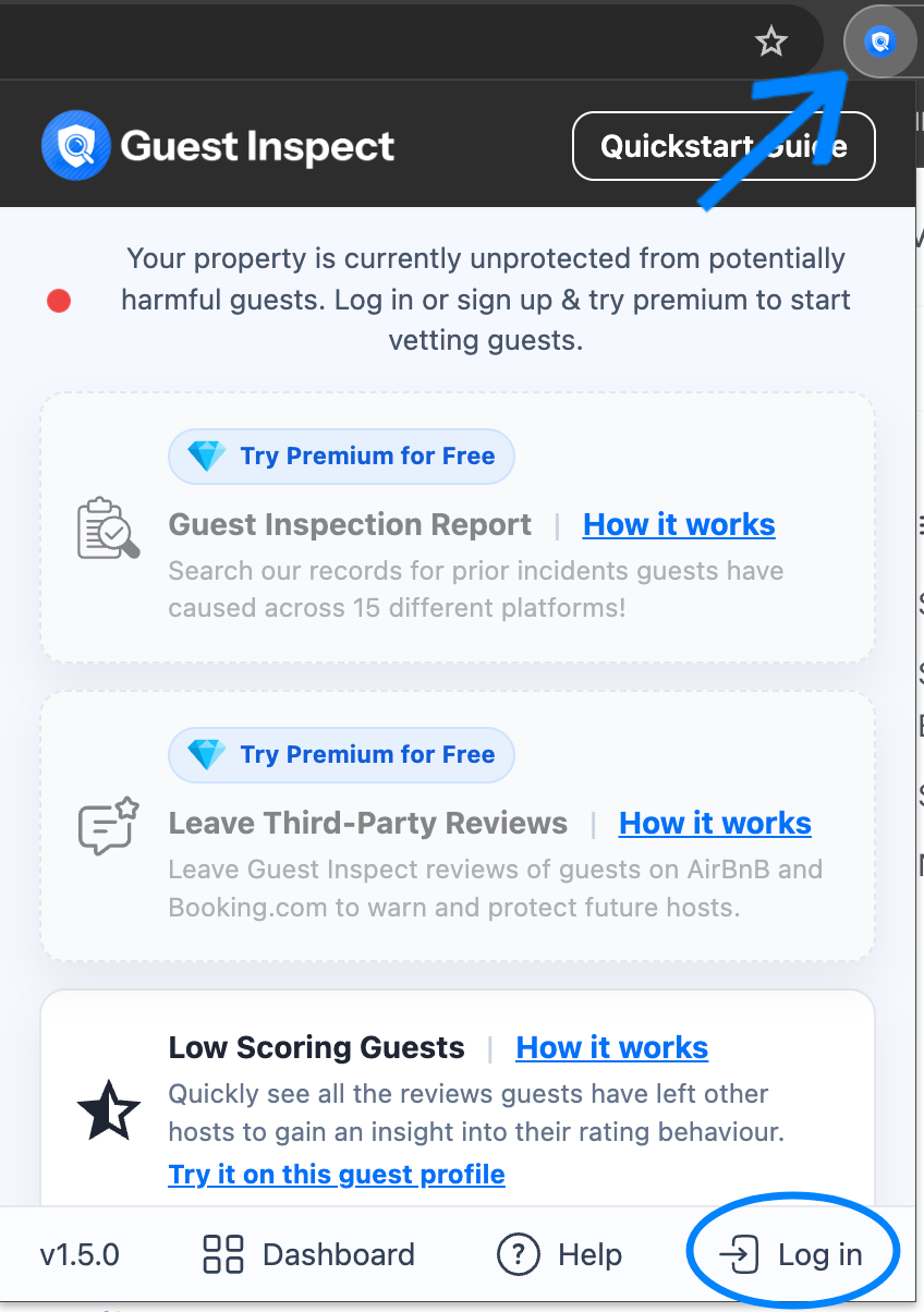 Open the Guest Inspect extension by clicking the icon which should now show to the right of your URL bar. Now click Log in in the bottom right and enter in the account details you used to sign up in step 1.